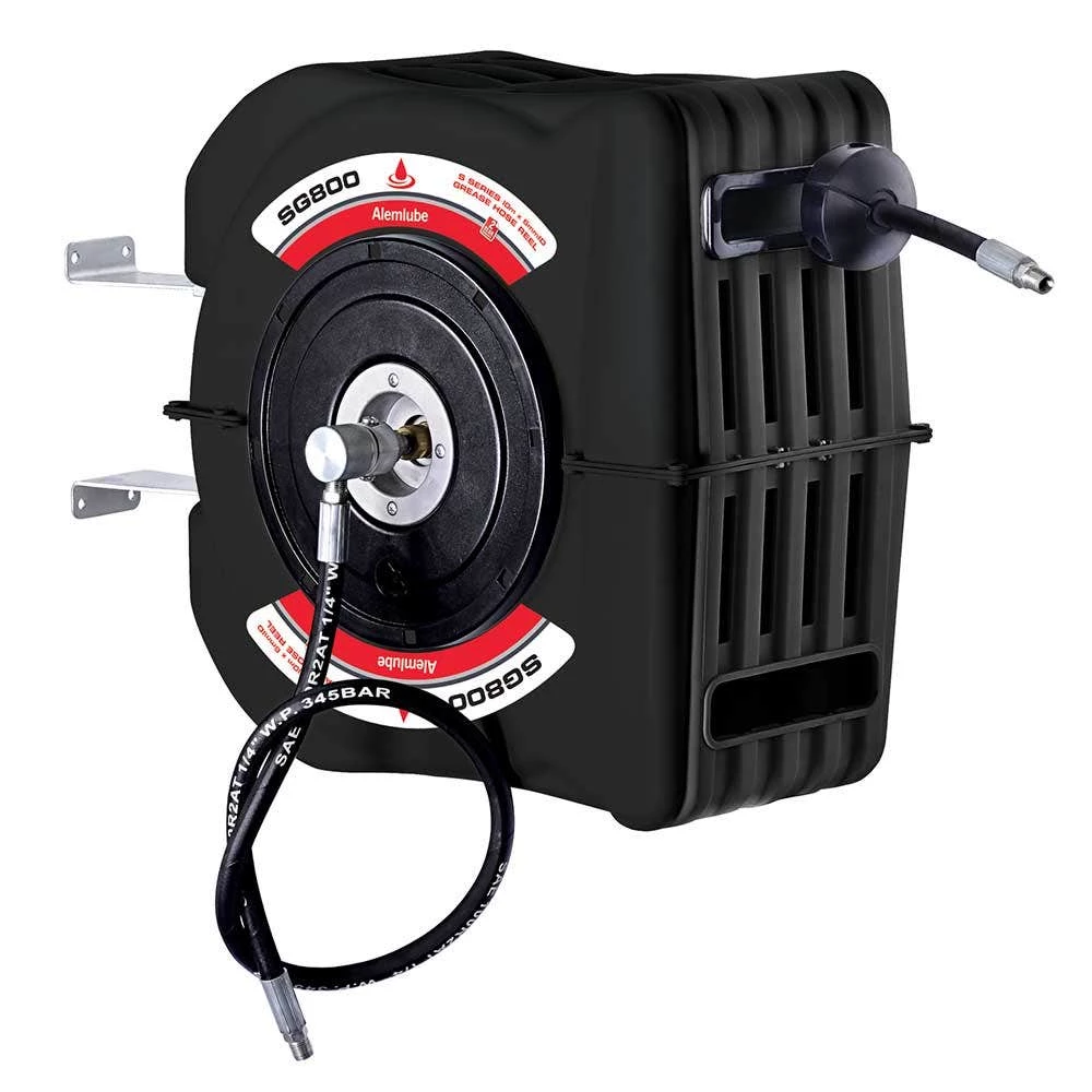 The Alemlube SG800 grease hose reel is a genuine industrial quality hose handling, retrieval and storage system with highly flexible and durable S.A.E.100R2 rubber hose, crimped hose ends, integral carry handle and detachable mounting bracket.