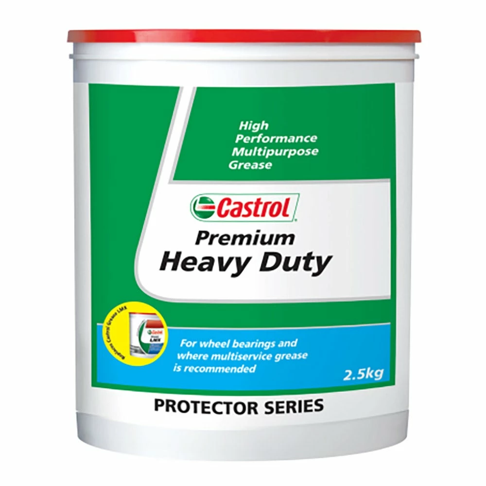 Designed for plain and roller bearing applications operating at temperatures beyond the limits of conventional Lithium greases. The excellent stability, load carrying, and high-temperature performance of Castrol Premium Heavy Duty make it particularly suitable for use in wheel bearings of vehicles operating at high speeds over long distances, or where prolonged heavy braking is likely to give higher than normal hub temperatures.