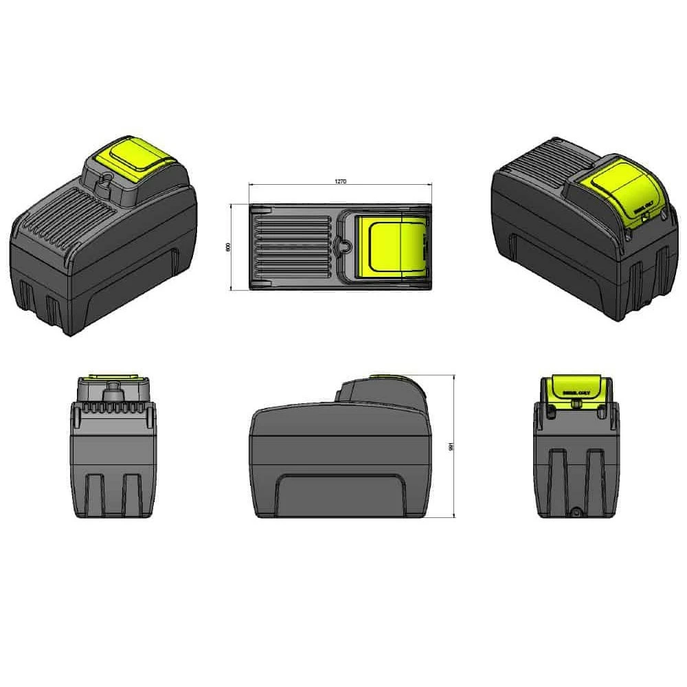 Piusi 12v 45L/min pump, 6m of 3/4″ delivery hose with auto shut off nozzle, heavy-duty tank with drain & 15-year warranty, double-hinged lock-able pump cover, protected tank breather system, pump bolted to a large removable aluminum lid, 4m battery cables, anti-static earth strap, integrated lifting handles.